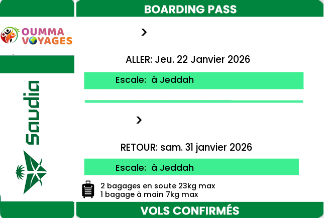 OUMMA VOYAGES vous propose une formule Omra du Jeu. 22 Jan. au Sam. 31 Jan.. Profitez de cette période dans les lieux saints de l’Islam.
