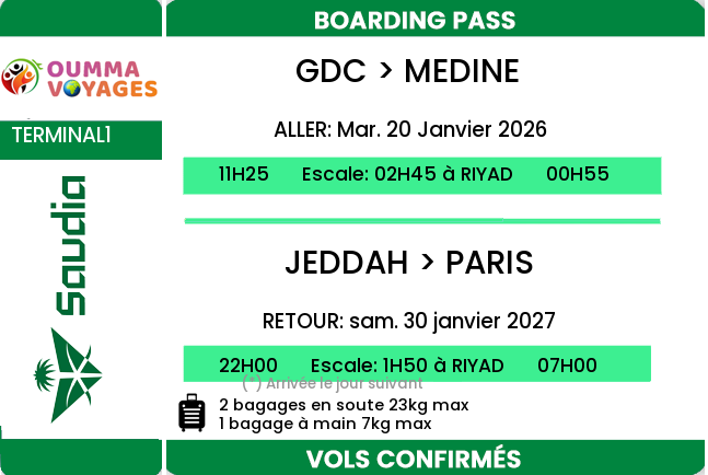 OUMMA VOYAGES vous propose une formule Omra du Mar. 20 Jan. au Sam. 30 Jan.. Profitez de cette période dans les lieux saints de l’Islam.