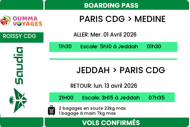 Le séjour comprend des visites guidées à Médine et à la Mecque . La omra sera encadéee et se fera en groupe avec votre guide