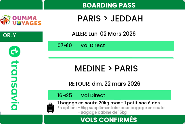 OUMMA VOYAGES vous propose une formule Omra du Lun. 02 Mar. au Sam. 21 Mar.. Profitez de cette période dans les lieux saints de l’Islam.