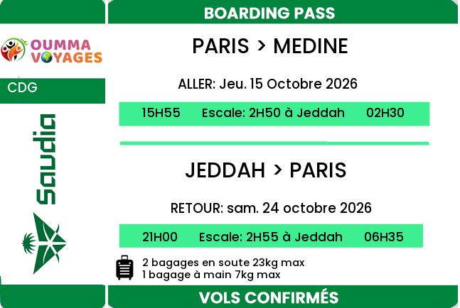 Le séjour comprend des visites guidées à Médine et à la Mecque . La omra sera encadéee et se fera en groupe avec votre guide