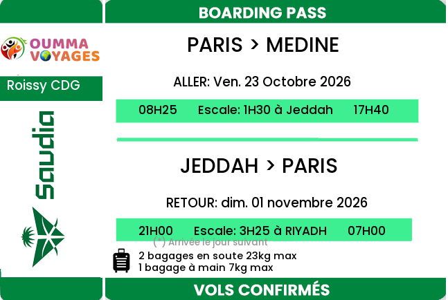 Le séjour comprend des visites guidées à Médine et à la Mecque . La omra sera encadéee et se fera en groupe avec votre guide